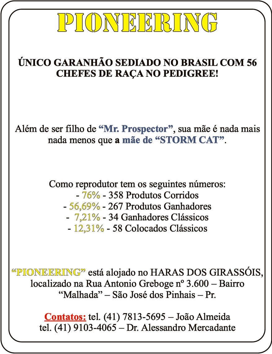 MARKET CORNER, 3 anos, filho de Fahim em Bossa Nova (Choctaw Ridge), de criação do Haras Santarém e propriedade do Stud Chesapeake, venceu sua primeira carreira em CJ em sua 2ª apresentação, em 1800 m grama, no tempo de 1:51´532 por cabeça. Market Corner foi dirigido por Nelson Souza e é treinado por Pedro Nickel Filho.