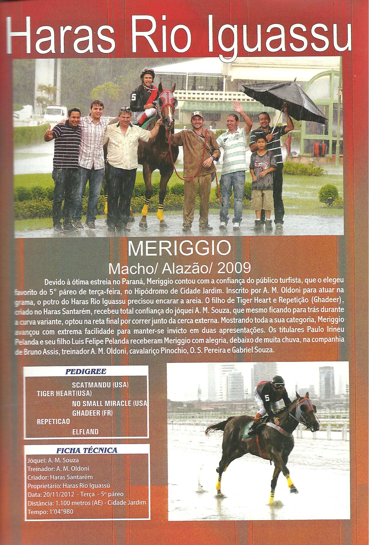 MERIGGIO, 3 anos, filho de Tiger Heart em Repetição (Ghadeer), de criação do Haras Santarém e propriedade do Haras Rio Iguassú, venceu sua 5ª carreira (1 em CJ, 1 no Tarumã e 3 pencas na Fazenda Rio Grande) em 1100 m areia pesada, no tempo de 64´9 por 2 ¼ corpos. Meriggio foi dirigido por A M Souza e é treinado por A M Oldoni.