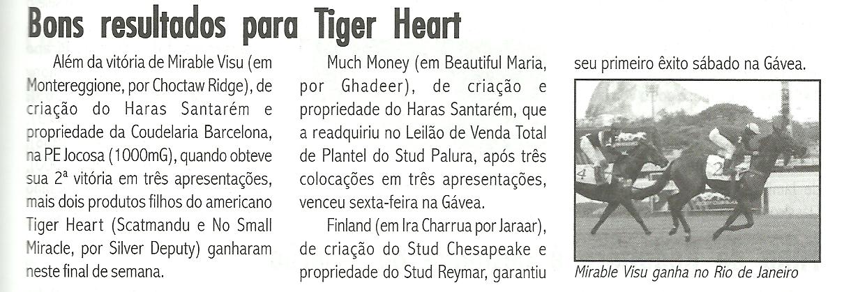 SUN WORLD, 3 anos, filha de Tiger Heart em Mapa The World (Roi Normand), de criação do Haras Ereporã e propriedade de João Carlos dos Reis, venceu sua primeira carreira em 1100 m areia, no tempo de 68´3 por ½ corpo. Sun World foi dirigido por Lu Andrade (ap 3ª) e é treinado por E S Machado.