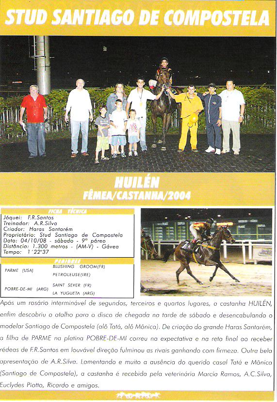 HUILÉN – 4 anos, filha de Parme e Pobre de Mi (Saint Sever), de criação do Haras Santarém e propriedade do Stud Santiago de Compostela, conquistou sua primeira vitória na Gávea em 1300m, areia pesada no tempo de 82´34 por diferença de cabeça. Huilén foi dirigida por F. R. Santos e é treinada por A. R. Silva.