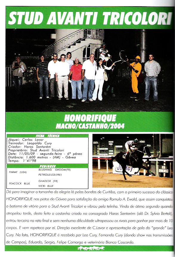 HONORIFIQUE, macho, 4 anos, filho de Parme e Peacock Blue (Ghadeer), de criação do Haras Santarém venceu em grande estilo a 4ª vitória de sua campanha (3 no Tarumã e 1 na Gávea), em 1600 m areia macia, no tempo de 101’98 por 10 ½ corpos. Honorifique é de propriedade do Stud Avanti Tricolori, foi dirigido por Carlos Lavor e é treinado por Leopoldo Cury.