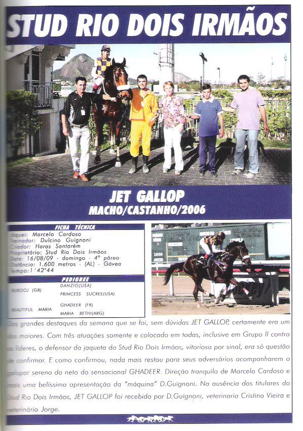 JET GALLOP, 3 anos, filho de Burooj e Beautiful Maria (Ghadeer), de criação do Haras Santarém e propriedade do Stud Rio Dois Irmãos, venceu sua primeira carreira na Gávea após já ter colocações na esfera clássica. Jet Gallop foi dirigido por M. Cardoso e é treinado por D. Guignoni.