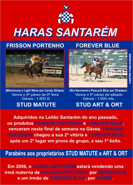 ALFARRÁBIO, macho, castanho, 4 anos, filho de Parme e Seam (Polish Navy), de criação do HARAS SANTARÉM e de propriedade do STUD CORREAS, conquistou, nesta quinta-feira, sua 2ª vitória, sendo 1 no Tarumã. Foi corrido na expectativa como todo filho de Parme gosta, para uma atropelada fulminante na reta de chegada. Parabéns ao STUD CORREAS.