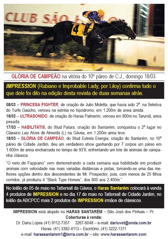 A 2 anos HILARIS – Parme e Nortica (Kitwood) depois de dois 2ºs lugares venceu neste sábado 1000 grama, em 57´7 por 5 corpos. É de criação do Haras Santarém e propriedade do Stud Ana Beatiz e Guilherme. Recebe o treinamento de M. Borioni e teve a direção de T. J. Pereira. Hilaris foi adquirida no leilão do Haras Santarém, na Gávea, em 2006. Os nossos parabéns para os titulares do Stud Ana Beatiz e Guilherme, bem como para os profissionais.