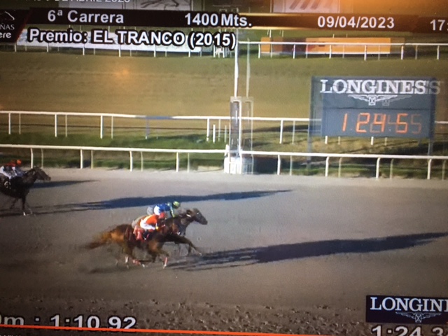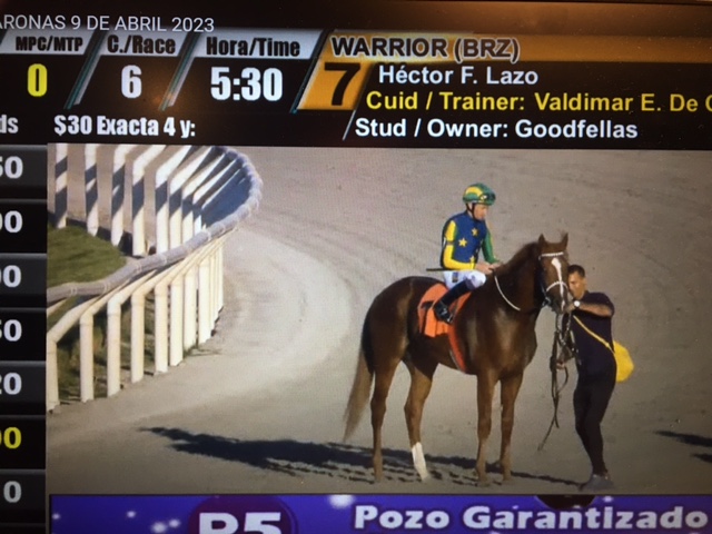 09/04 – Maroñas – WARRIOR, 3 anos filho de Goldeo em Iced Whisky por Redattore, criação do Haras Santarém e propriedade do Stud Goodfellas, venceu sua 2ª carreira em 1400 areia no tempo de 84´49 por meia cabeça. Warrior foi conduzido por Héctor Lazo e tem Valdimar E Oliveira como seu treinador em substituição a A L Cintra.